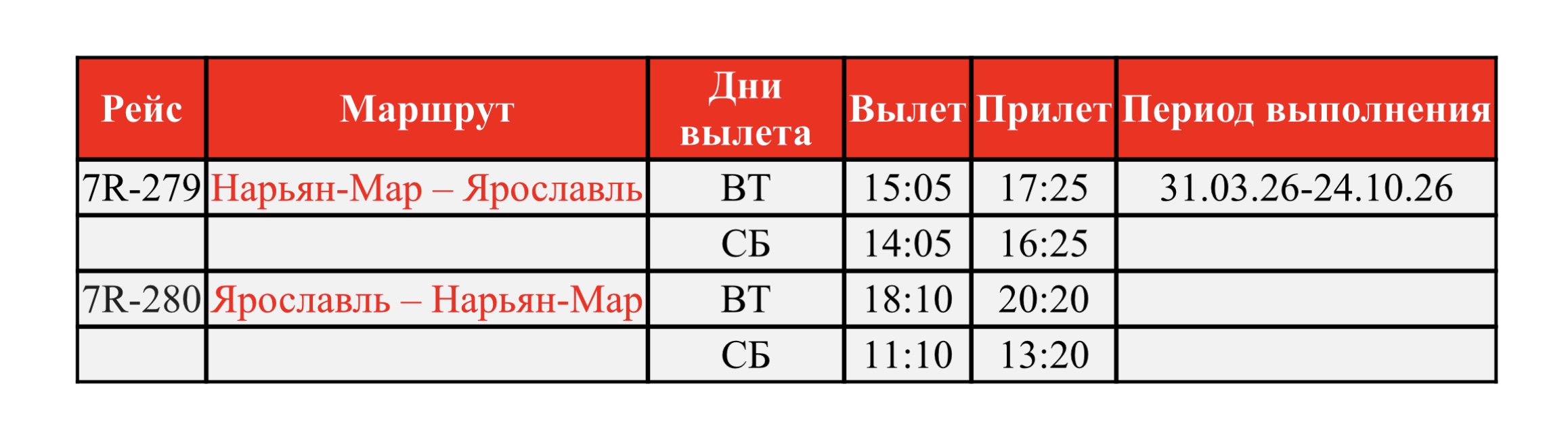 Авиакомпания «РусЛайн» с 31 марта 2026 года запускает регулярные рейсы по новому маршруту Нарьян-Мар – Ярославль. Полеты будут выполняться по вторникам и субботам на комфортабельных 50-местных канадских самолётах Bombardier CRJ100/200. Время в пути составит 2 часа 20 минут. Стоимость билетов в одну сторону – от 8 861 рубля (с учётом всех сборов авиакомпании, возможны агентские сервисные сборы, количество мест ограничено).